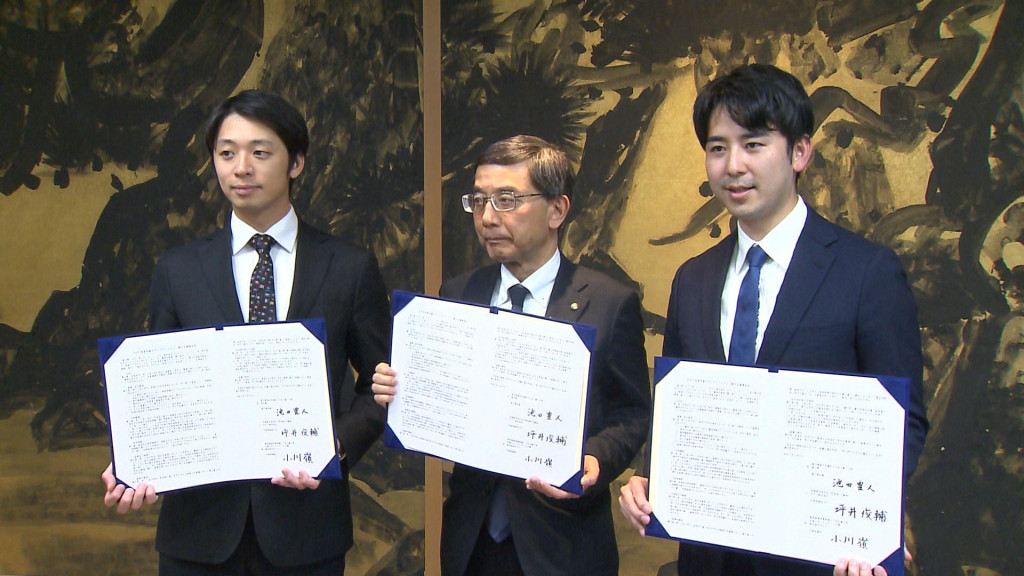 この日、県庁で行われた締結式では、香川県の大山智副知事が両社の代表と協定書を交わしました。
