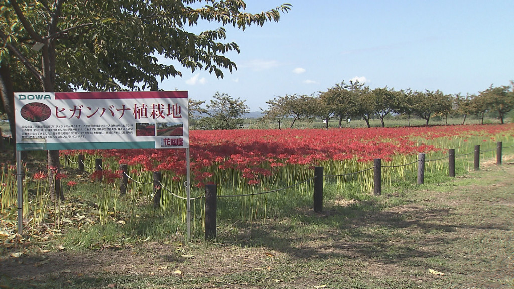 真っ赤なじゅうたんを敷き詰めたように咲いたヒガンバナ。花回廊ゴルフコースに隣接する緑地を花で彩られた名所にしようと、DOWAホールディングスと地域住民らでつくる「児島湖花回廊サポーターズクラブ」がおよそ80万株を育てています。
