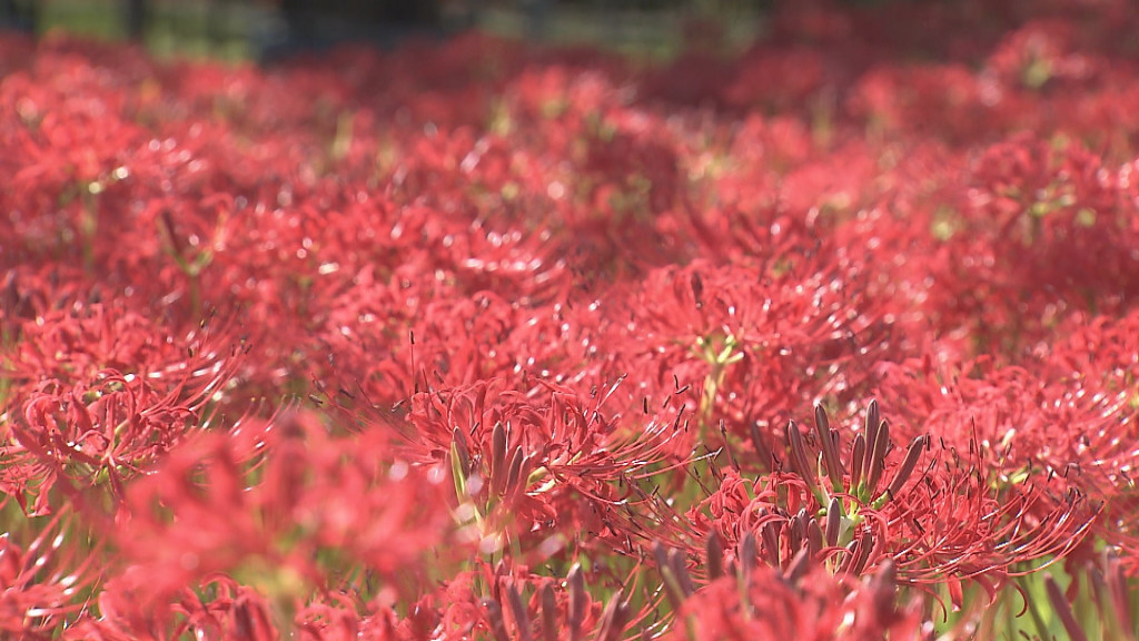 秋の訪れを感じさせるヒガンバナが、岡山市南区の自然緑地・児島湖花回廊で見ごろを迎えています。