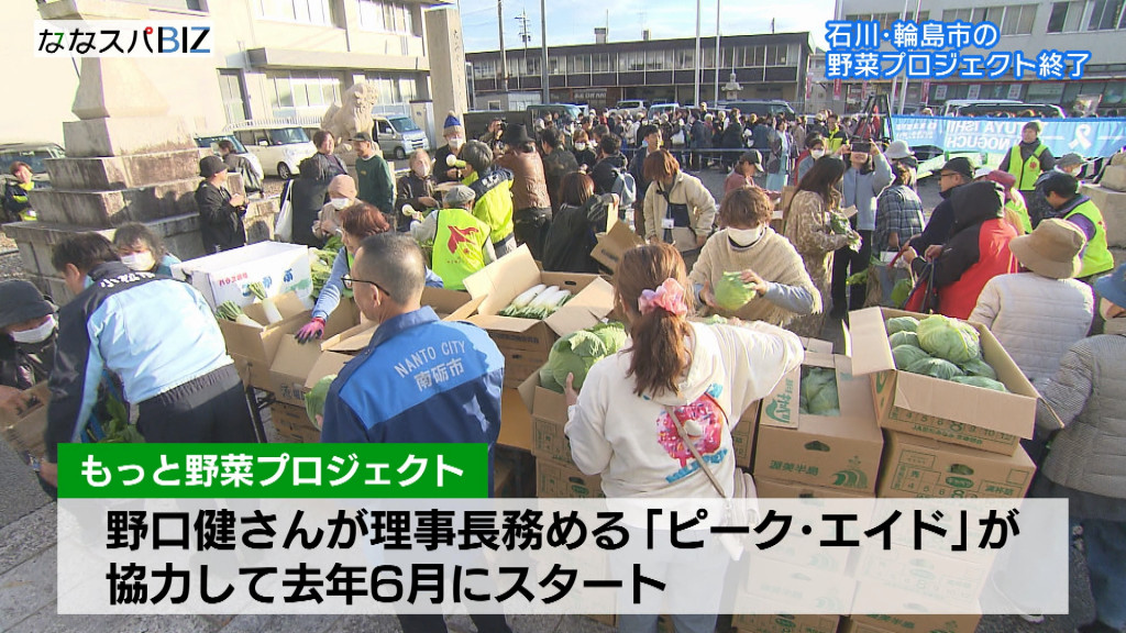 毎週土曜日の午後3時から輪島市中心部の重蔵神社で物資を配る「もっと野菜プロジェクト」は、登山家の野口健さんが理事長を務めるNPO法人ピーク・エイドが協力して昨年6月にスタート。その後、総社市の片岡聡一市長の呼びかけで支援の輪が全国に広がり、総社、赤磐市のほか、宮崎県延岡市や福島県いわき市など全国14の市や町が資金面で支援。コメや野菜、飲料水などを当初は無料で、昨年7月からは100円、10月からは300円で配布してきました。