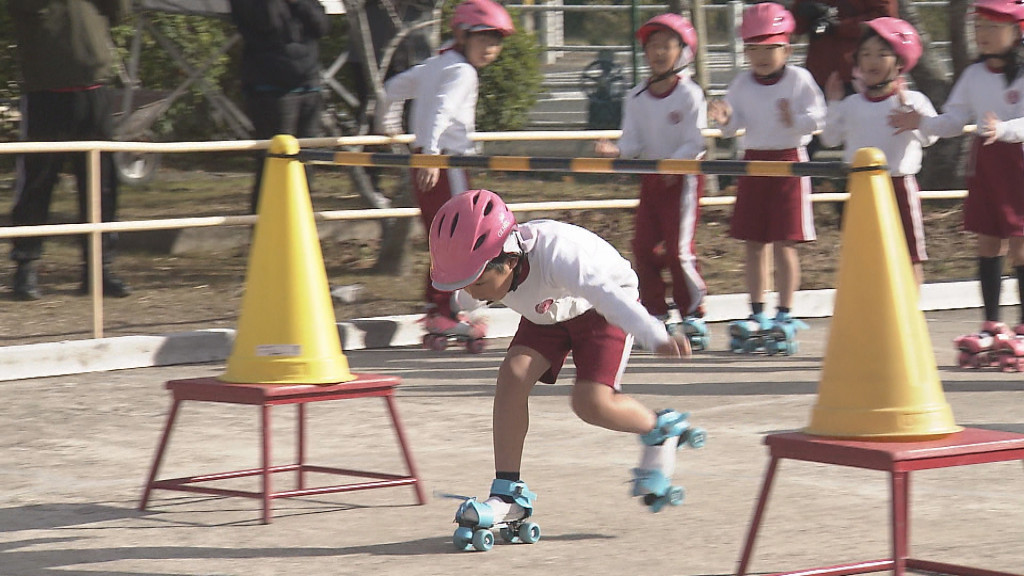 児童らはローラースケートをはいてバーをくぐったり、ボールをパスして、かごにシュートを打ったりし、見学に訪れた保護者や地域住民から拍手が送られていました。