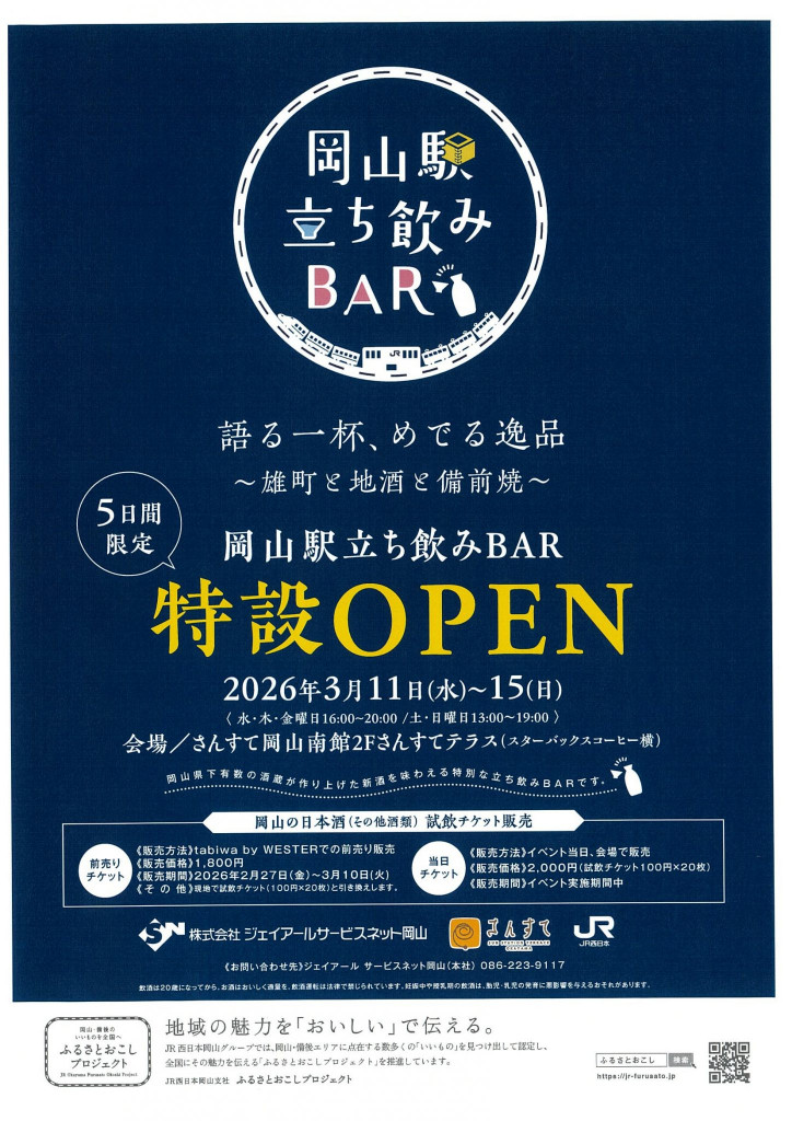 ジェイアールサービスネット岡山とJR西日本岡山支社は3月11日から15日の5日間、JR岡山駅のさんすてテラスで、岡山の地酒や備前焼の魅力をPRする「岡山駅立ち飲みBAR 語る一杯、めでる逸品~雄町と地酒と備前焼~」を開きます。チケット制で、有料試飲を行います。