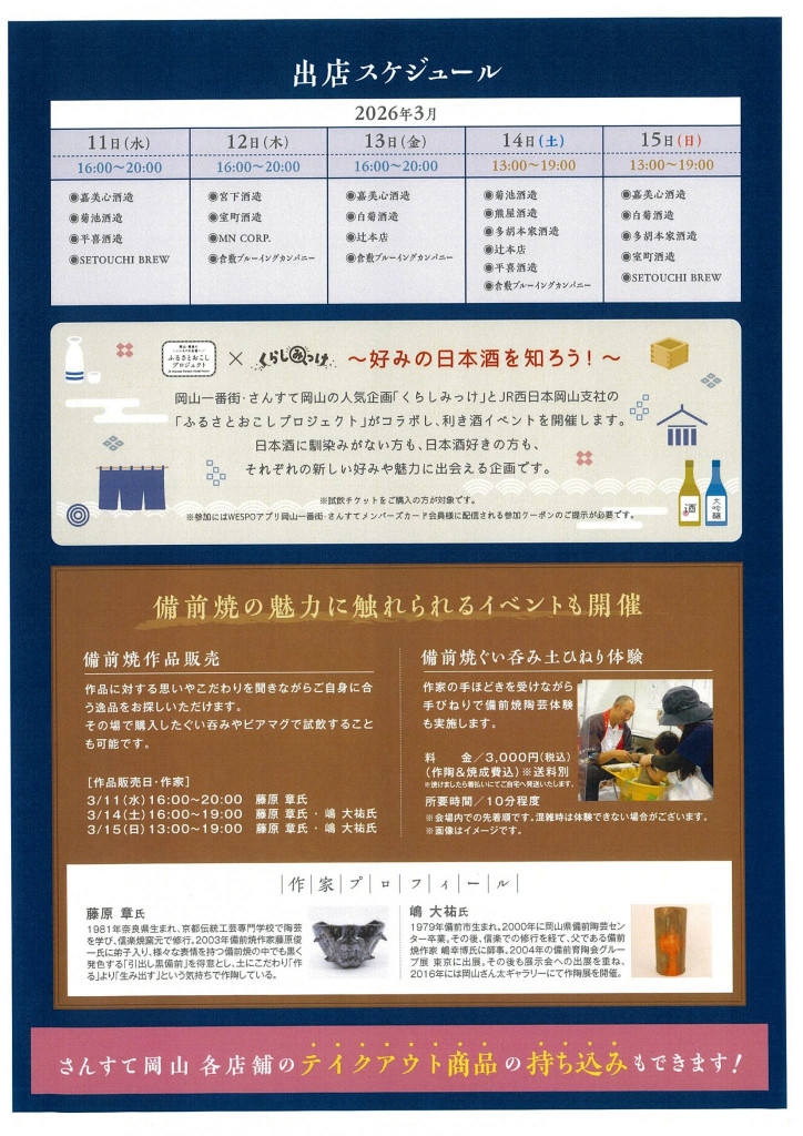 酒蔵や備前焼作家と有料試飲や作品販売など対面での交流を通し、多くの人に岡山の地酒、備前焼の持つ深いストーリーや制作者の思い・こだわりなどに触れてもらう狙いです。