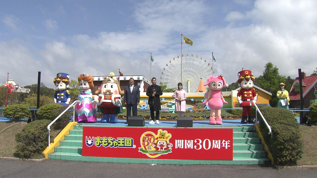 玉野市のテーマパーク「おもちゃ王国」は4月27日、開園30周年を迎え、記念のセレモニーが開かれました。