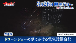 電気通信工事や放送設備を手掛けるキムテックは、ドローンショービジネスに挑んでいる。2021年夏の東京五輪開会式で繰り広げられた光のショーに魅了された木村裕士社長が「地域を盛り上げたい」と、香川発のショーを目指して新会社を設立。番組では、今年2月に実現した試験飛行の模様を紹介した。